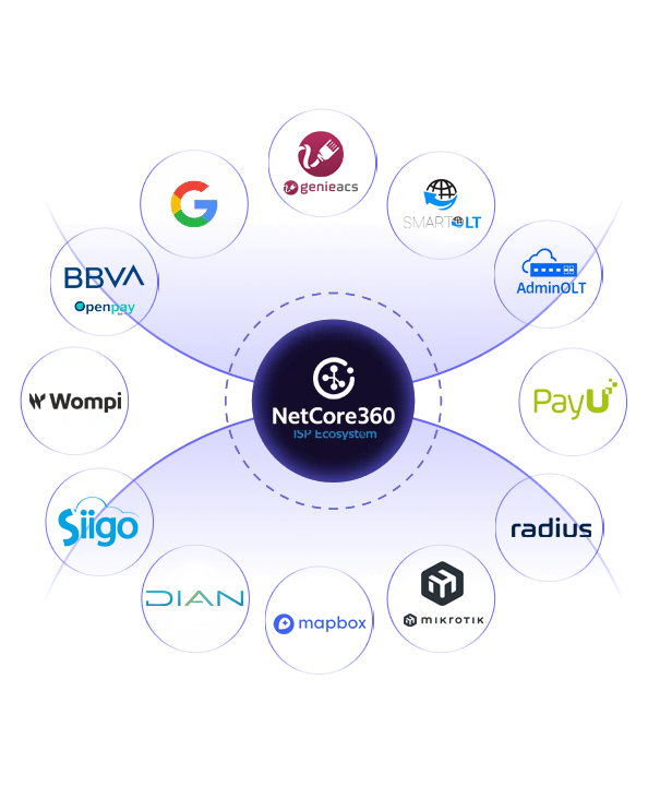 El ecosistema de NetCore360 integra Radius, ACS, Facturación Electrónica, firma electrónica y Smart OLT en una sola plataforma.